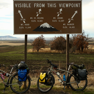 C’est après Moses Lake que le décor de Washington prend forme. Nous apprenons maintenant par nous-même ce que cet état a réellement à offrir. Ce plateau intérieur que nous roulons est en réalité un immense plateau fait de basalte sur plus de quatre kilomètres de profondeurs. Nous nous trouvons en effet dans le « Columbia Wildlife Refuge » quand nous observons pour la première fois des colonnes de pierres noires sortir de terre. On s’enfonce dans des canyons, on parcourt des vallées imprévisibles sur une profonde couche de gravier avant de retrouver un autre plateau et tout doucement, à l’ouest, se dessine la chaine des Cascades. Les pics que l’on observe de notre piédestal sont de renommée internationale (comme tout aux États-Unis vous me direz). Il y a Mount Hood, Mount Rainier, Mount Adams et le célèbre Mount St Helens à vue. Tous sont des volcans perchés entre deux mille cinq cents et quatre mille mètres d’altitude. Et oui, mesdames et messieurs, nous faisons du vélo sur des coulées de laves qui ont plus de quinze millions d’années et qui ont vécu plusieurs grands « Wash Out » après les derniers grands épisodes glaciers. Le grand sauveur d’un dégât des eaux dans l’intérieur de l’état, c’est tout simplement le fleuve Columbia avec sa percée miraculeuse à la façon de Roland (brèche de) à travers la chaine des Cascades pour purger le trop d’eau. L’attraction des montagnes est bien entendu inévitable, puissante. Lentement, nous parviendrons à leurs pieds de ses montagnes mais un détour s’impose avant le passage dans le canyon Columbia.